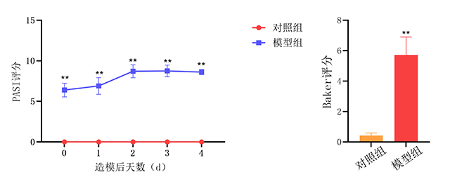 评价指标:PASI表观评分及Baker病理评分、HE染色、ELISA检测