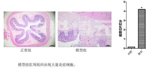造模:8周龄SD大鼠适应性饲养1周,将醋酸稀释为75%醋酸水溶液,一次性注射器抽取0.05ml分点注射于大鼠肛周皮下,24小时后观察到大鼠肛周出现白色溃疡,肛周肿胀并有炎症溢出,则表明模型制备成功。