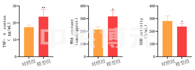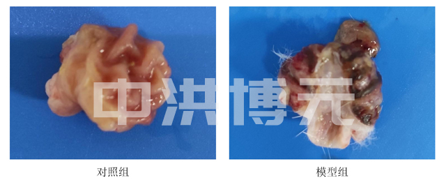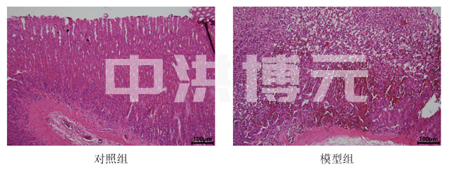 对照组结构正常,无明显病理变化;模型组样本均可见黏膜层大量出血现象,存在一定程度炎性细胞浸润,同时可见黏膜上皮细胞严重受损,出现溶解现象,形成局部溃疡,模型有效