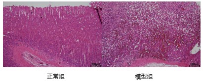 模型组样本均可见黏膜层大量出血现象,存在一定程度炎性细胞浸润,同时可见黏膜上皮细胞严重受损,出现溶解现象,形成局部溃疡。