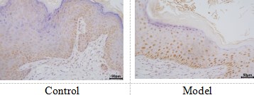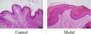 正常组上皮组织结构正常,除部分样本有少量炎性细胞浸润外,无明显病理变化;模型组上皮组织均可见基底层增厚,2号样本和8号样本有少量毛细血管增生,有模型趋势。